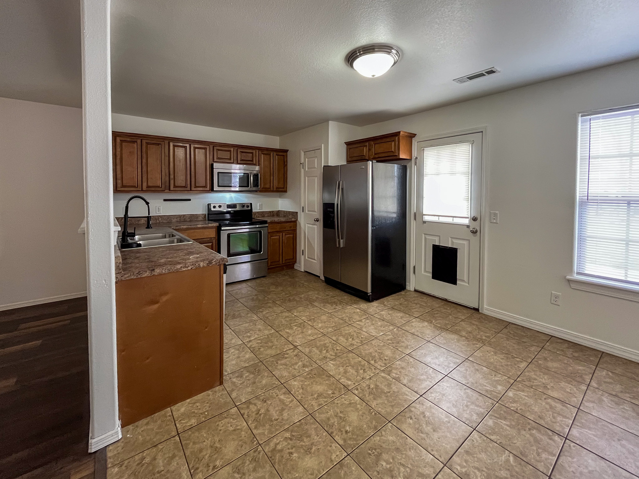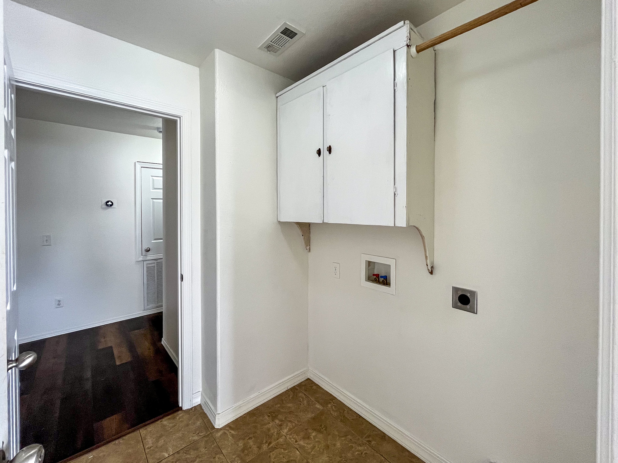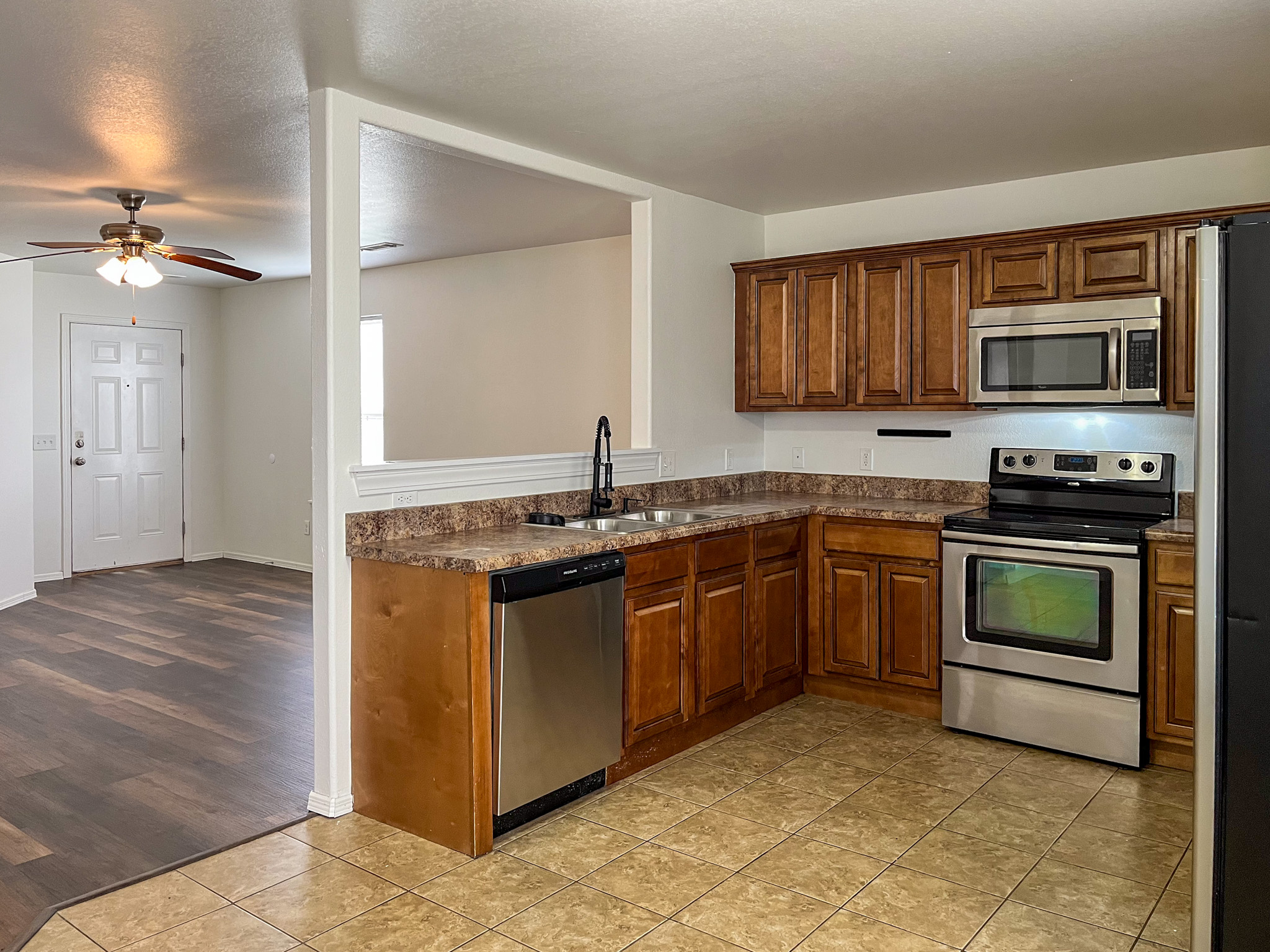The open layout includes an eat-in kitchen with all the essentials: refrigerator, stove, dishwasher, built-in microwave, disposal, pantry, and easy-to-clean tile floors. You’ll also find a dedicated laundry room with washer/dryer hookups right where you need them.
