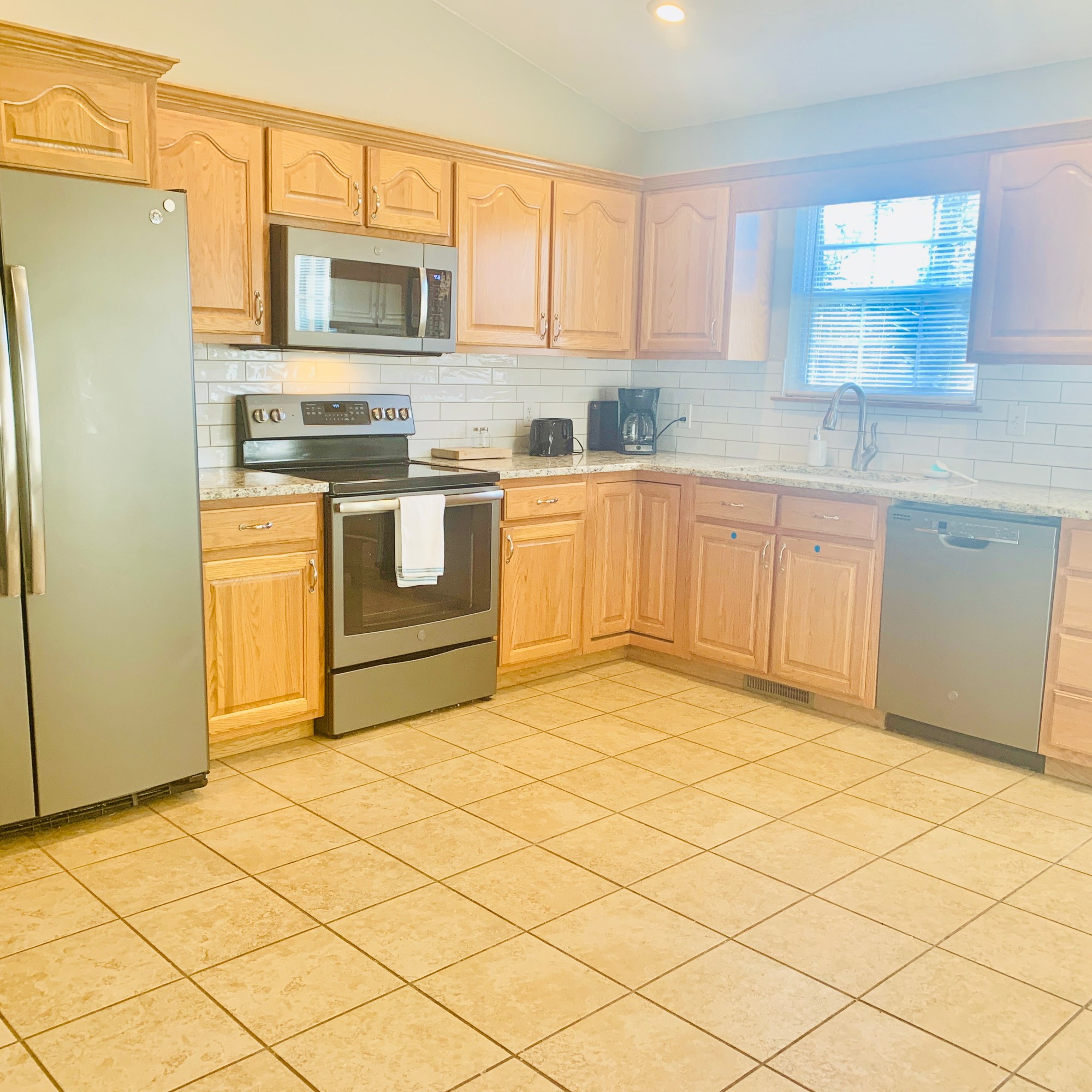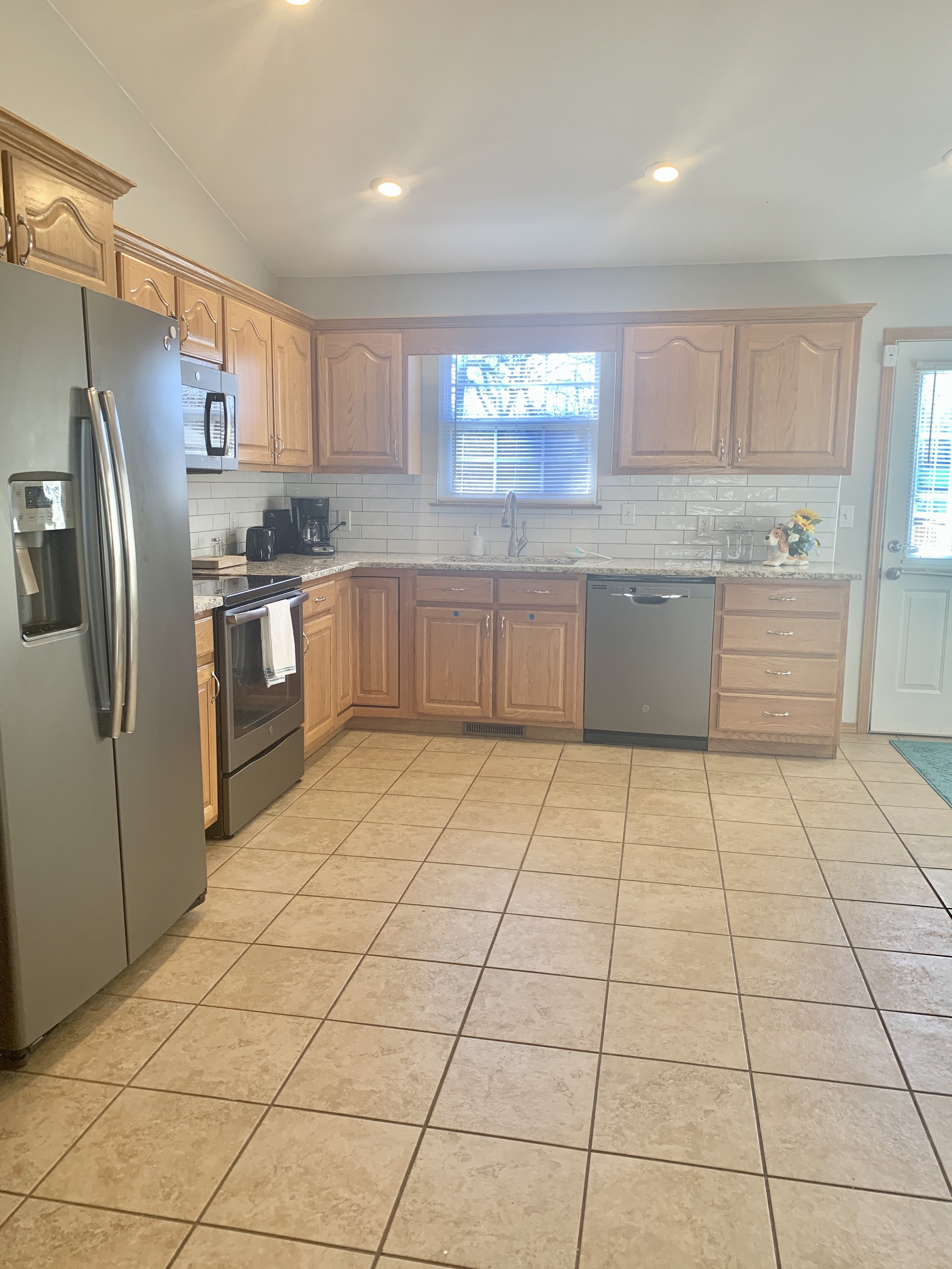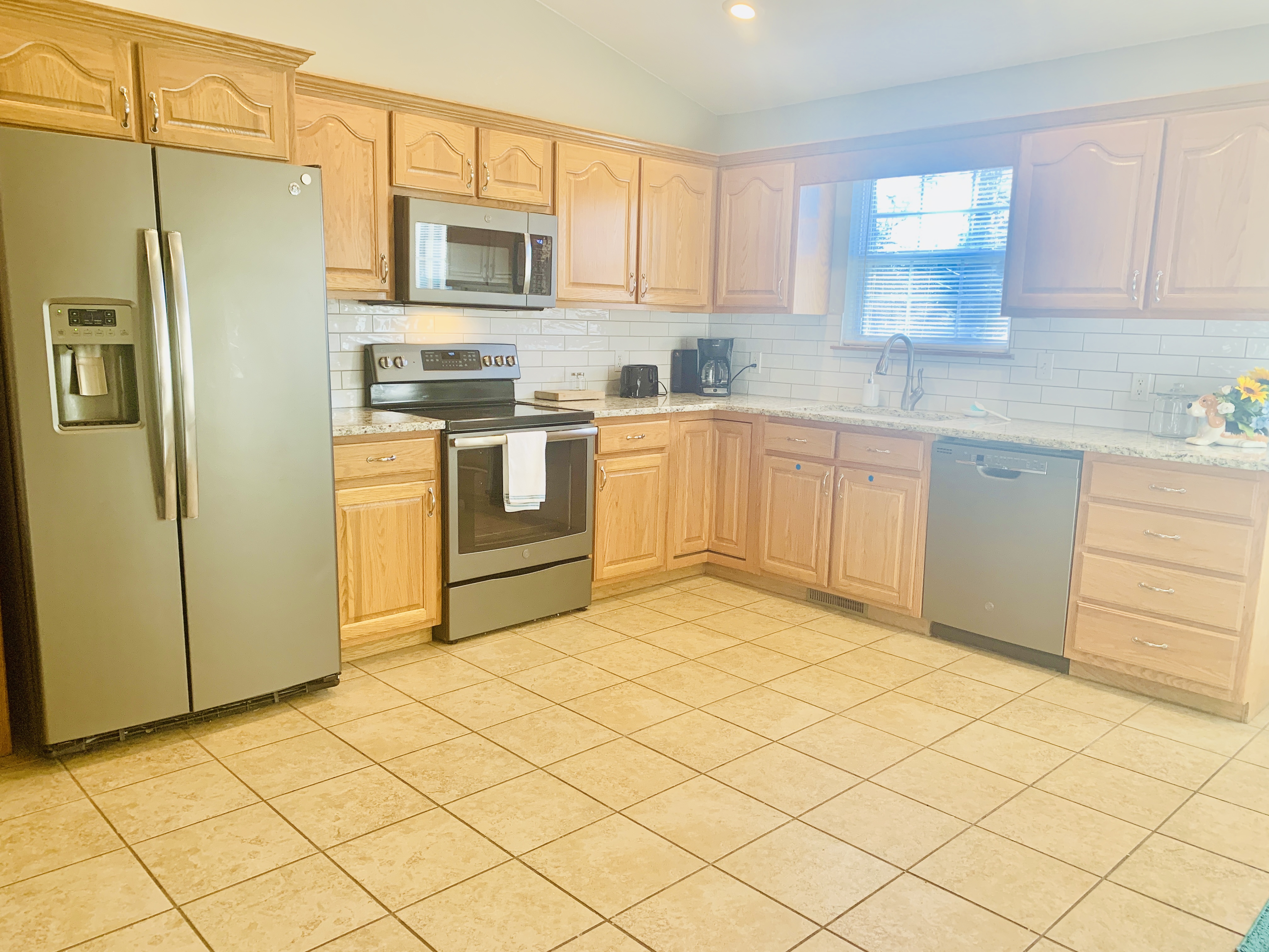 Inside, you’ll find a mix of laminate, tile, and carpet flooring, plus fresh paint throughout. The eat-in kitchen comes fully equipped with essential appliances: refrigerator, stove, dishwasher, built-in microwave, and disposal—plus plenty of cabinet space for everyday living.